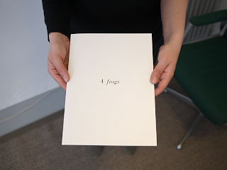 Quatre grenouilles apparaissent en négatif et déambulent parmi les pages du livre. 4 Frogs est un jeu formel, qui contraste avec le reste du travail de Jochen Lempert. Biologiste de formation, il entreprend dans son oeuvre photographique une patiente observation de la nature, tout en témoignant et mettant en perspective nos représentations du monde organique. Par une approche évoquant Jean Painlevée, il propose ici un regard à la fois nouveau et archaïque sur l'animal, dont les mouvements semblent émaner de la page. Fixés dans un déplacement chaotique, les reflets des batraciens s'organisent pourtant sous notre regard en des sortes de constellations, en une organisation presque sensible et qui indique à notre vue la frontière de notre compréhension du vivant. DV
